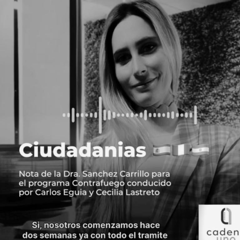 La Dra. Sánchez Carrillo fue entrevistada en el programa Contrafuego por Carlos Eguía, donde habló sobre nuestros servicios de derecho migratorio, incluyendo la tramitación de ciudadanías argentina, española e italiana. En esta primera parte de la nota, compartimos detalles clave para quienes buscan obtener su ciudadanía y cómo podemos ayudarlos en todo el proceso. NOTA
